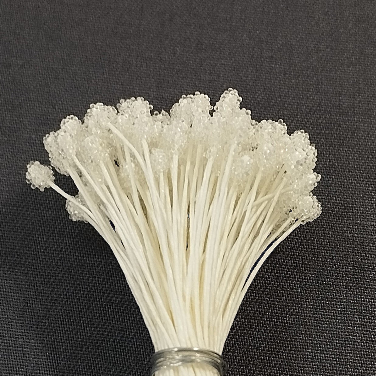 両端に粒がついており二つ折りにしてフローラテープで巻き花芯を作ります。